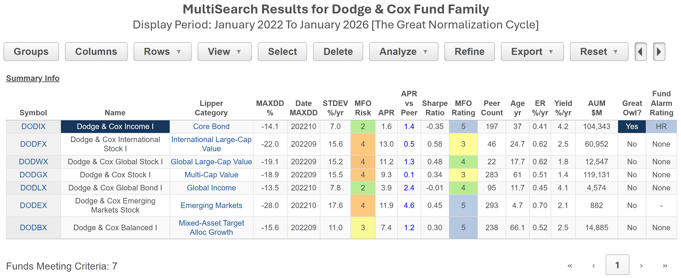 MultiSearch, our main search tool, will sort through thousands of funds based on up to 300 screening criteria. Its Pre-Set Screens provide an easy way to get a quick overview on markets and notable funds. The example below depicts risk and return metrics for the Dodge & Cox fund family during the current market cycle, coined "The Great Normalization." Only a few of the more than 1000 metrics available in the table are illustrated.