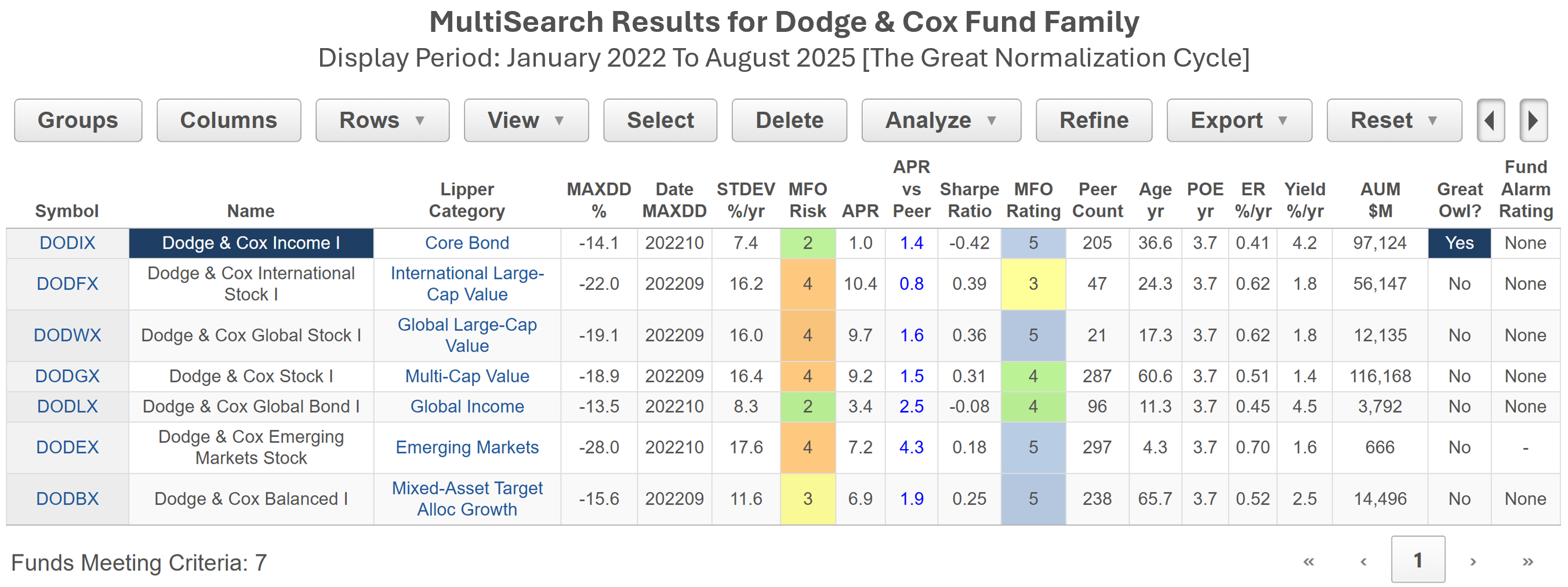 MultiSearch, our main search tool, will sort through thousands of funds based on up to 300 screening criteria. Its Pre-Set Screens provide an easy way to get a quick overview on markets and notable funds. The example below depicts risk and return metrics for the Dodge & Cox fund family during the current market cycle, coined "The Great Normalization." Only a few of the more than 1000 metrics available in the table are illustrated.