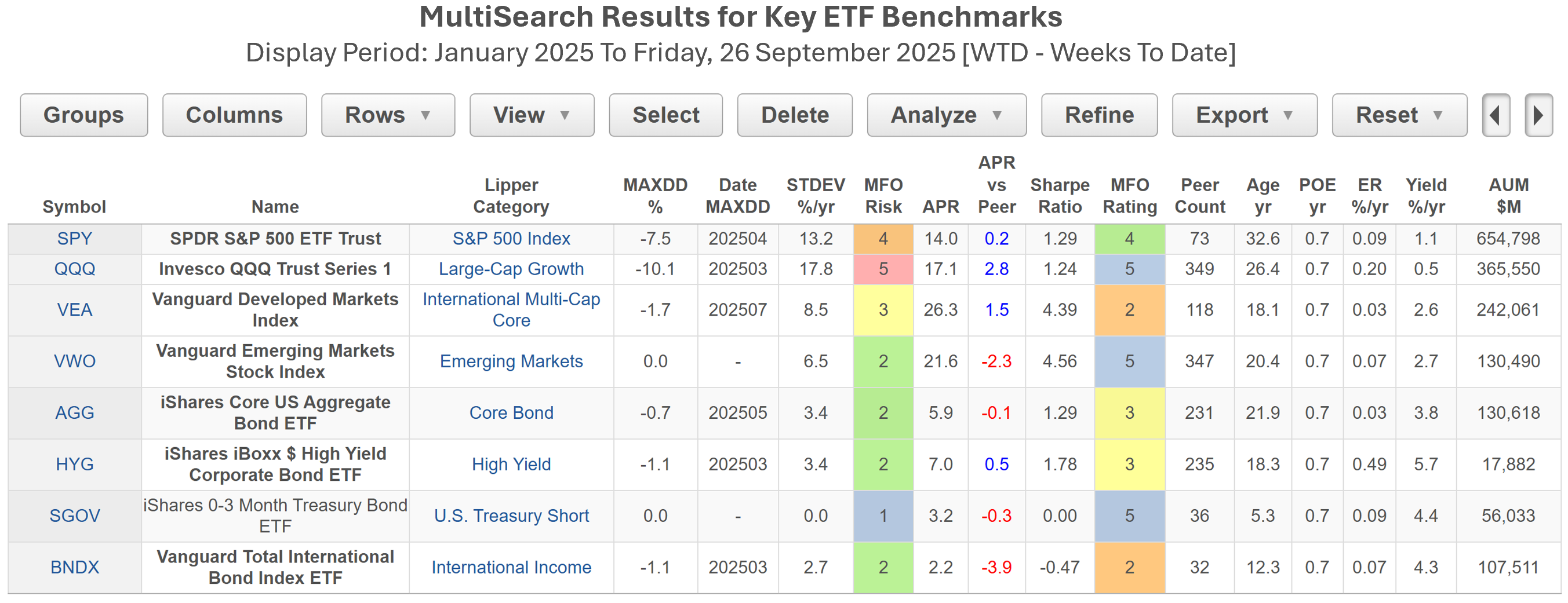 - A suite of analytics: Flows, Correlation, Rolling Averages, Up/Downside Capture, Calendar Year and Fixed Period Metrics, Batting Averages, Benchmark Comparisons, Trend and Momentum, Lipper Leaders, Category Averages and Ferguson Metrics.