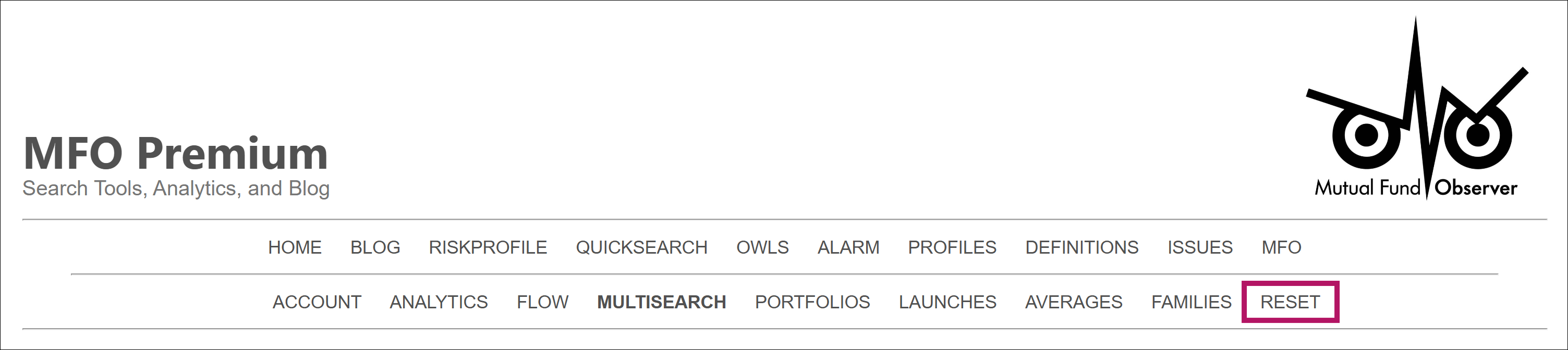 To clear the site memory, click the "Reset" link in the Navigation Bar at the top of any site page, shown in screenshot below. Note that logging out of MFO Premium via "Account/Log Out" link is another way to reset the site.